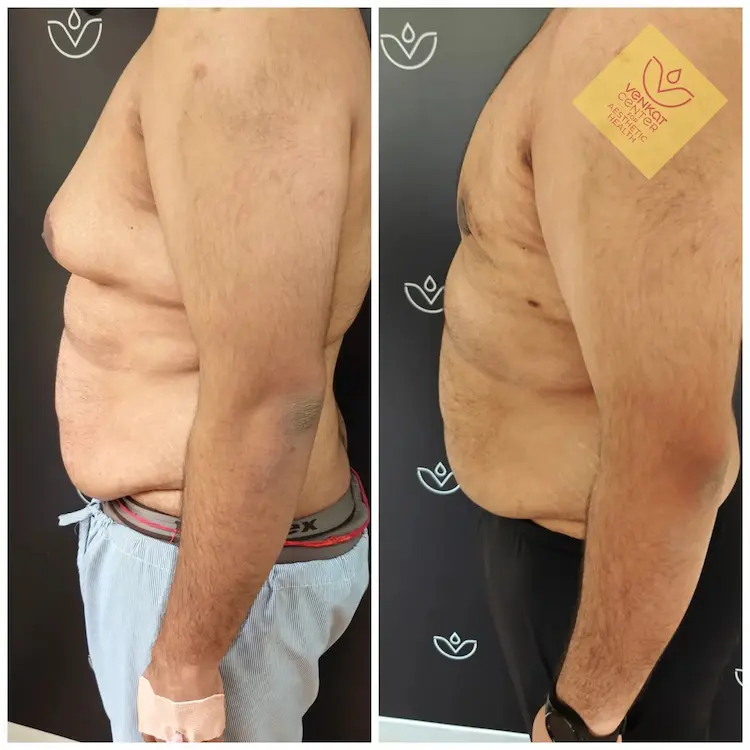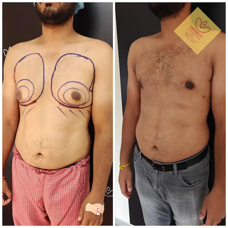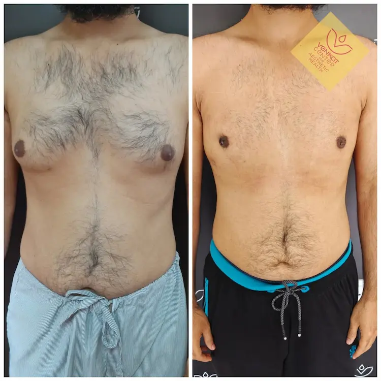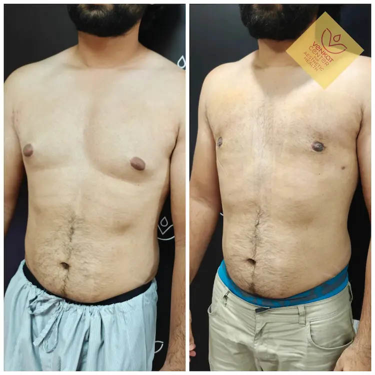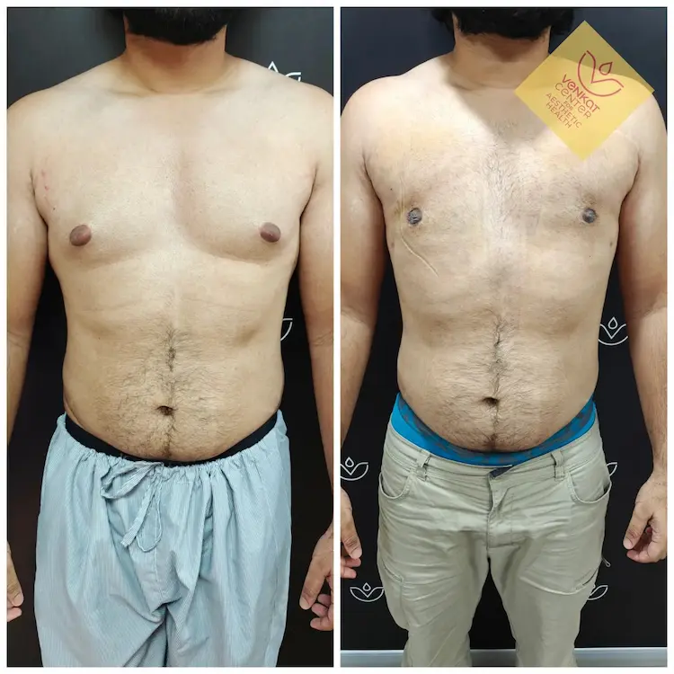 The stages are shown along with actual results after gynecomastia surgery from The Venkat Center in Bangalore.